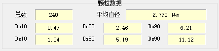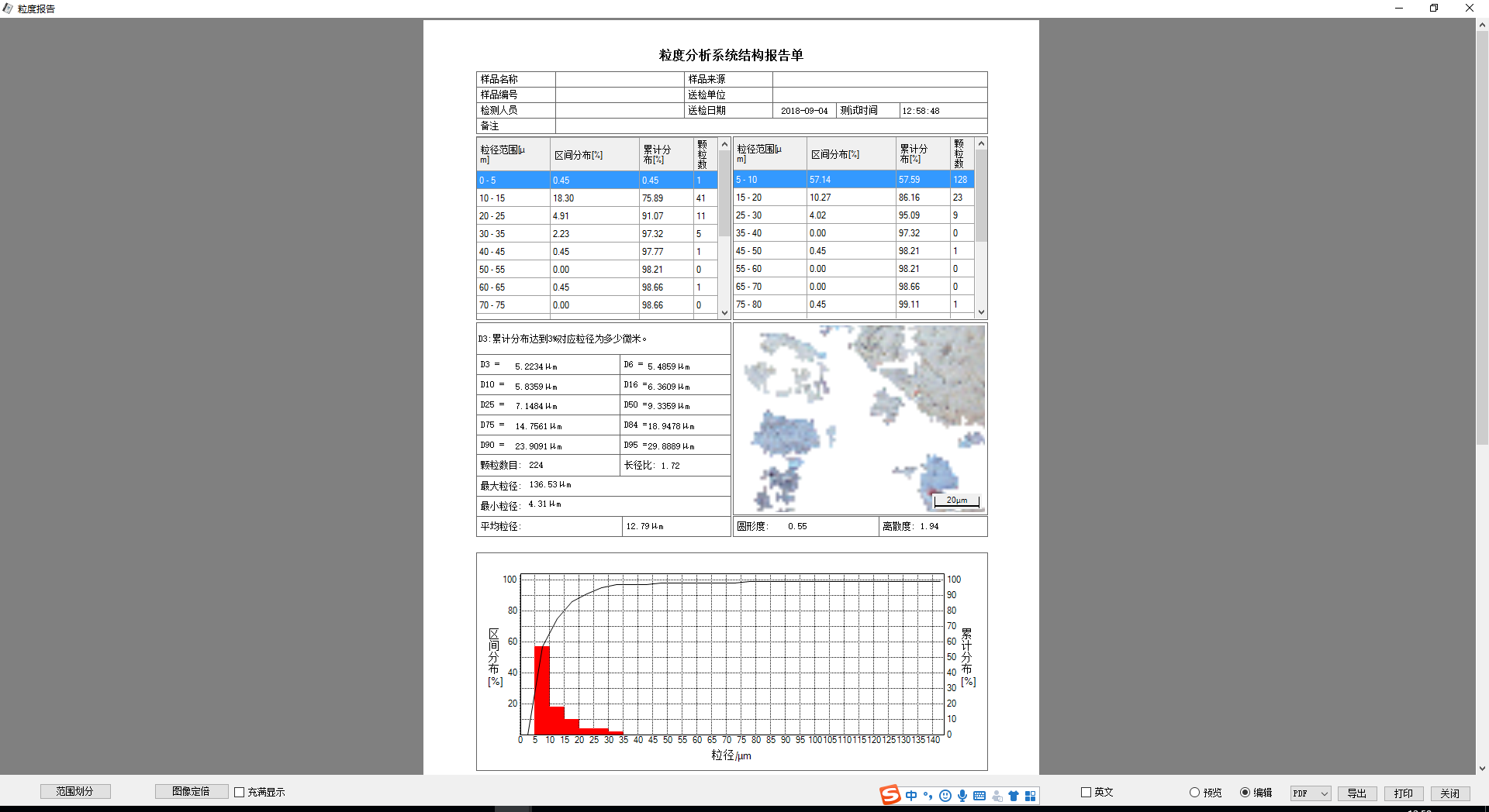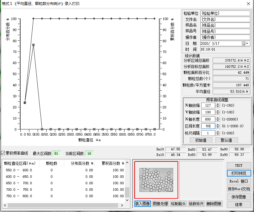 长轴、短轴、直径,以及颗粒总面积、颗粒面积百分比、颗粒总数、平均直径、颗粒数/平方毫米、DN10、DN50、DN90以及DS10、DS50、DS90等参数;统计颗粒直径区间的颗粒数、分布百分数、累积百分数,绘制统计图。