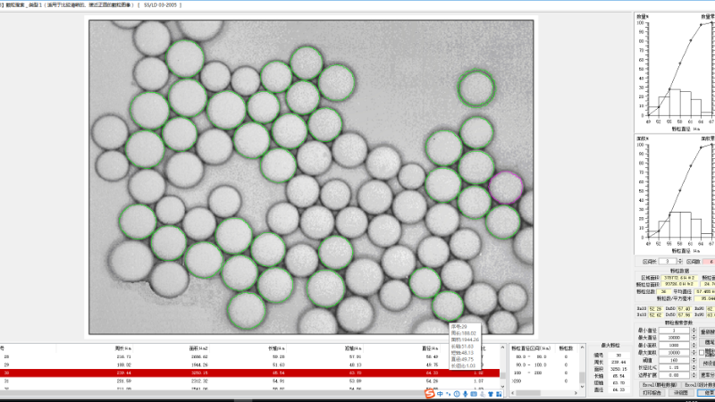 软件根据搜索参数,搜索出满足要求的颗粒,算出每个颗粒的周长、面积、