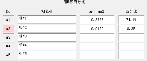 用鼠标提取5个不同组织的颜色,软件根据搜索参数,搜索出该组织每个颗粒的周长、面积、长轴、短轴、直径,自动算出该组织的面积和面积百分比。