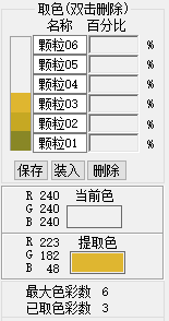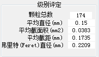 l 用鼠标在图上选取需要分析颗粒的颜色,可以选择6种颜色,然后设置搜索参数,搜索出想要的颗粒,并算出颗粒百分比;同时算出颗粒总数、颗粒平均直径、平均截面积、平均截距、弗里特直径、最小直径、最大直径、平均短轴长,长宽比>0.5的颗粒比等数据。