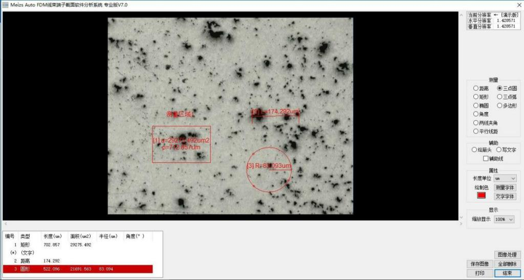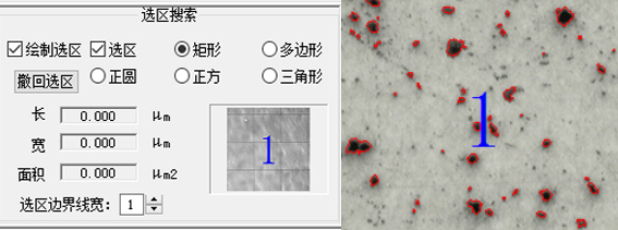 3、图像选区:提供了矩形、多边形、正圆、正方、三角形等选区工具,选完区后软件自动对选区区域进行一次孔隙分析。
