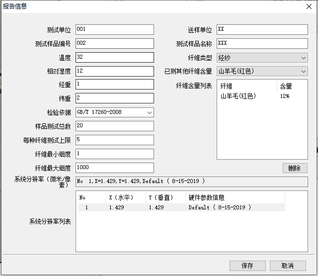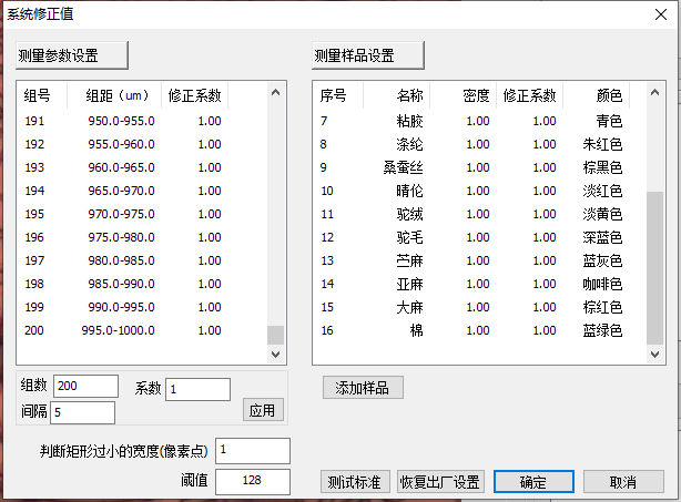 Ø 左边列表为测量参数,类别列表为测试样品列表,默认参数为图上所示,双击列表某行可以修改
