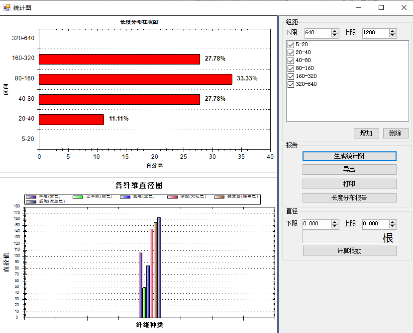 Ø 上图是纤维在各个组距的颗粒分别情况,下图为测量纤维的平均直径分布,可以调整组距,可以鼠标缩放曲线
