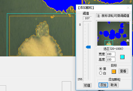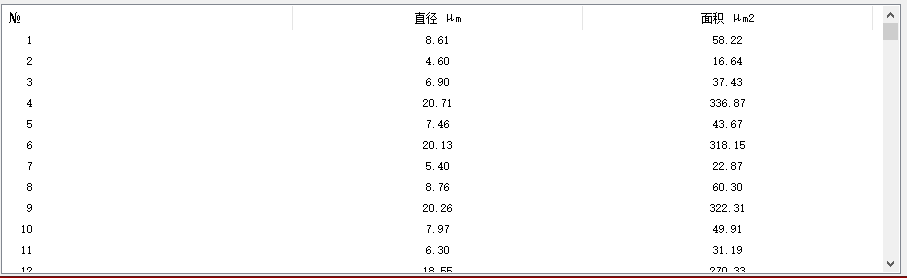 软件根据搜索参数,搜索出满足要求的颗粒,算出每个颗粒的周长、面积、
