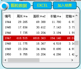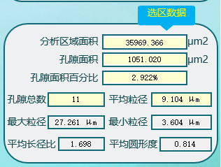 2、 孔隙分析:可分析出每个孔隙的周长、面积、长轴、短轴、等效圆直径、长径比、圆形度等数据。