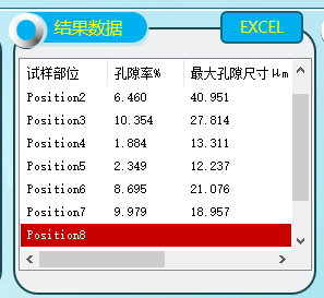 结果列表:预置了10个部位列表位置,每分析完一个选区的数据,就可加入到一个部位数据行,并算出孔隙率、最大孔隙尺寸、测试面积等参数。