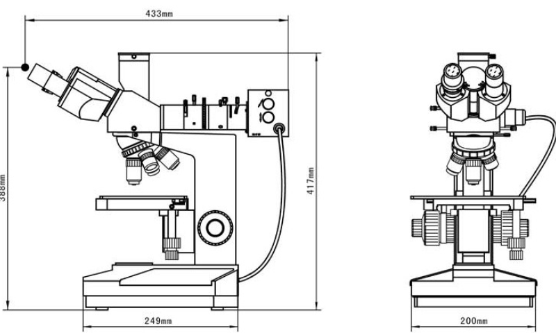 12V 20W,卤素灯, 亮度可调;落射照明器带视场光阑、孔径光阑、起偏振片。