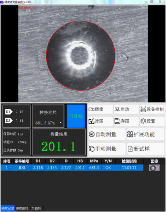 内置CCD图像自动测量系统, 操作界面模块化设计,可直观显示压痕直径,硬度值及硬度值曲线,转换标尺,检测时间以及图像等内容。 |