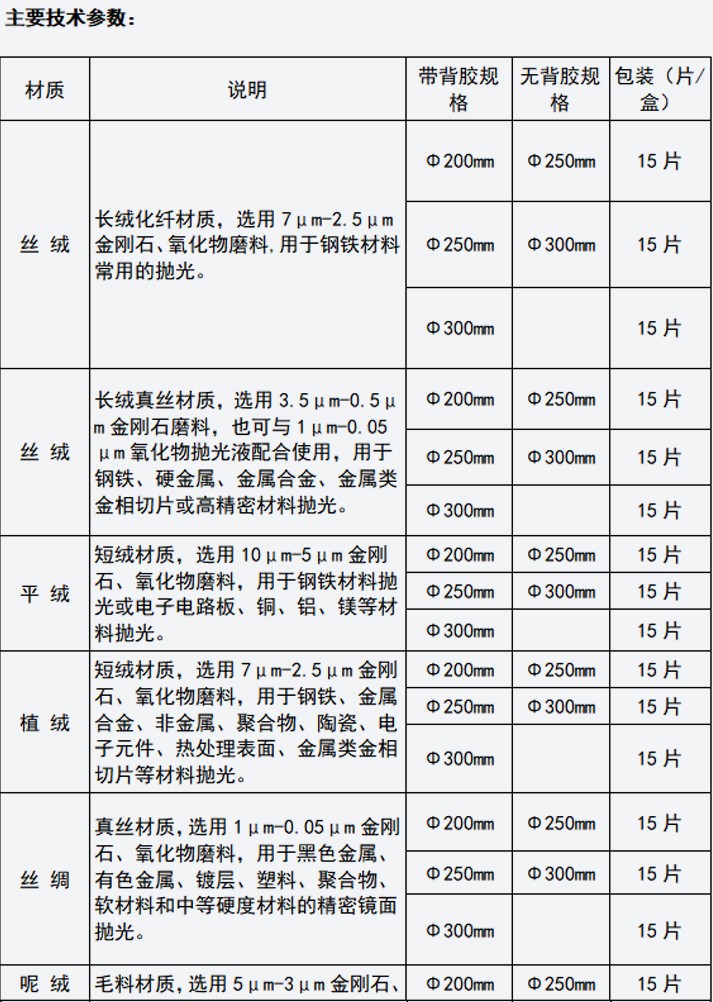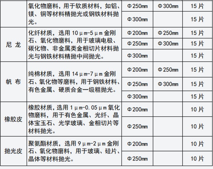 我公司研制和生产的金相抛光织物系列,专门用于金相制样时的粗抛和精抛。适用国内、外各种型号、规格的金相抛光机,尤其适用于手动、半自动、全自动金相研磨抛光机。将该系列抛光织物及本公司生产的金刚石研磨抛光系列产品和金相抛光润滑冷却液配套使用,可以磨抛出镜面效果。