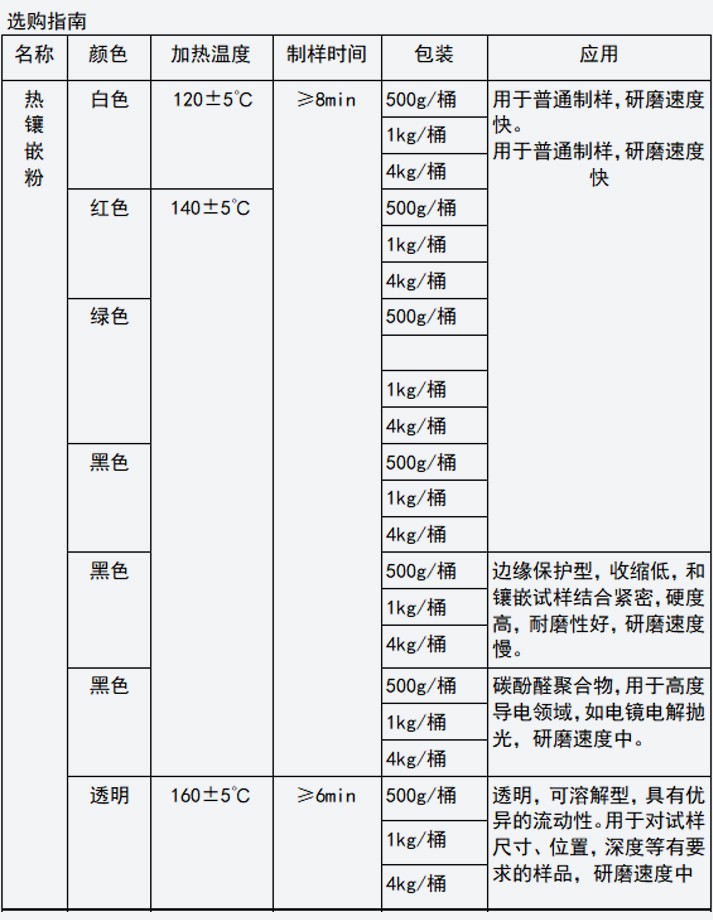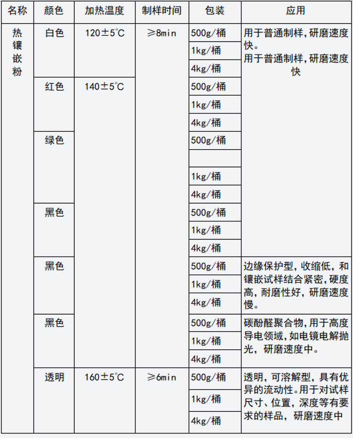 热镶嵌粉采用精细树脂砂为基础原料,以精选矿物或玻璃纤维为填充料,长时间热混炼后冷却造粒而制成。树脂在加热、加压情况下更易快速融化,结合优异的流动性使其迅速包覆填充样品,加速镶样进程,为磨抛做好试样的前期制备工作。