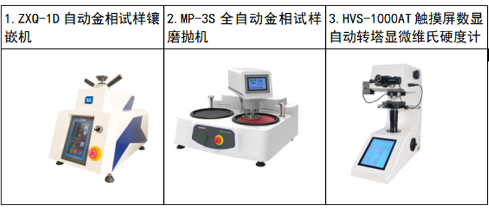 由于该试样形状不规则,所以需要进行镶嵌处理,由于试样本身尺寸较小,所以选择试验力相对较小的显微维氏硬度计来测量,经过多种样机反复对比试验,最终确认为触摸屏数显自动转塔显微维氏硬度计HVS-1000AT,辅助设备为:镶嵌机,磨抛机,测试设备如图: