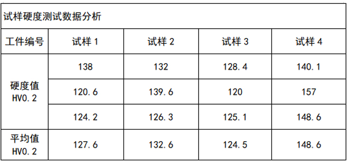 经测,试样1测试硬度为127.6HV0.2,试样2硬度值为132.6HV0.2,试样3测试硬度为124.5HV0.2,试样4测试硬度为148.6HV0.2,符合客户工艺要求硬度,测试合格。
