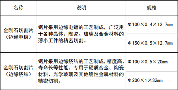 超薄金刚石切割片,分边缘电镀式和边缘烧结式两种工艺制成,精度高、寿命长等性能。专用于硬质合金、陶瓷材料、光学玻璃及其他脆性金属材料的精密切割